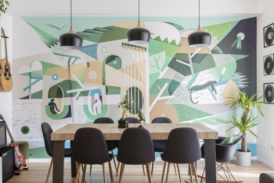 Sulla parete di fondo del soggiorno, visibile subito dall'ingresso, impera il disegno di un artista che ha interpretato la storia d'amore di Arianna e Giacomo. Abbiamo provveduto a stamparla su carta da parati e a trasformarla nella quinta principale della zona giorno. In tutto l'appartamento fanno da padrone i toni verdi, beige, nero e del legno.