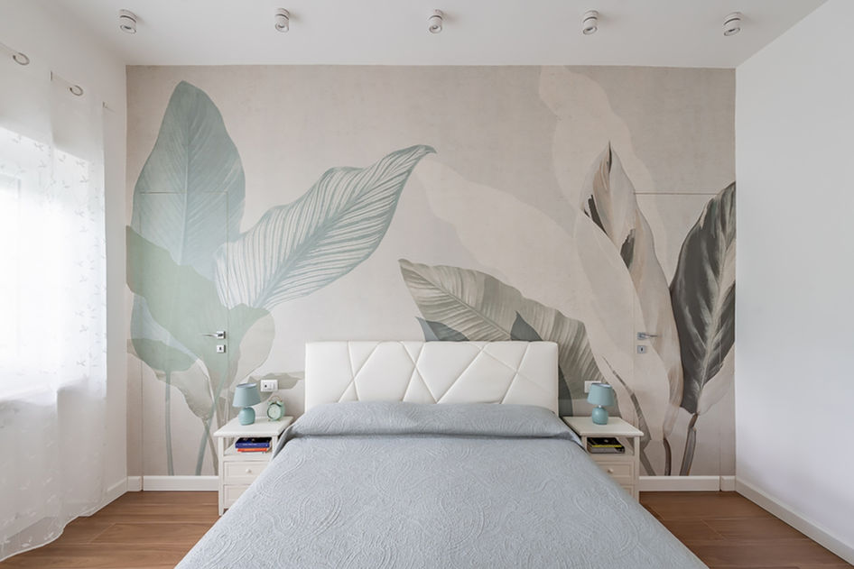 Nella camera padronale, per riquadrare l’ambiente è stata avanzata una parete in modo che risultasse ortogonale a quella d’ingresso alla stanza. Al suo interno si nasconde una cabina armadio alla quale si accede attraverso due porte “filomuro” laterali nascoste nel muro. Una carta da parati con foliage regala un prezioso ma rilassante fondale all’ambiente.