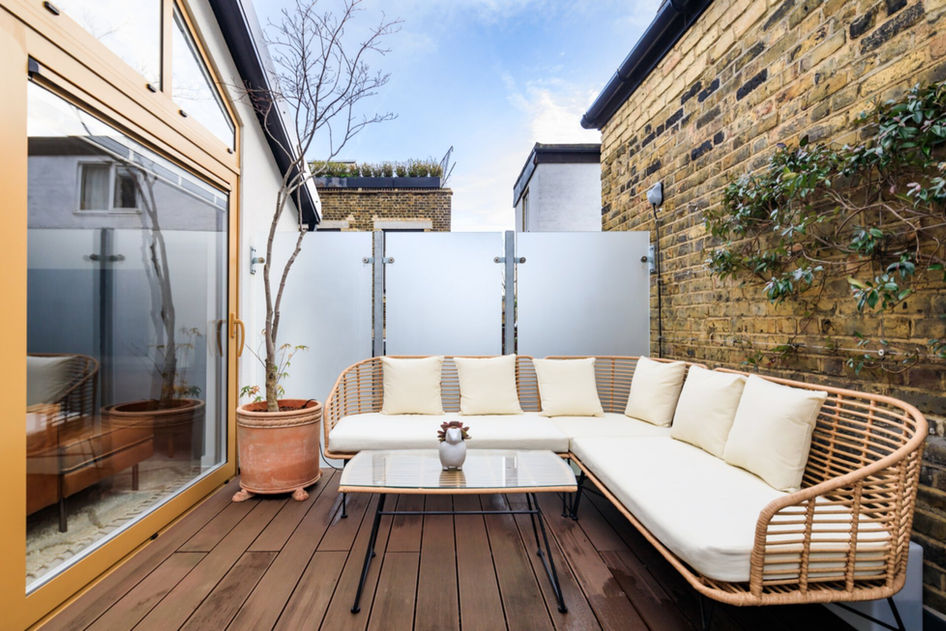 Il terrazzo, insolito negli appartamenti londinesi, è stato valorizzato con gli stessi accorgimenti usati negli altri ambienti, diventando a tutti gli effetti uno spazio vivibile in aggiunta ai 55mq dell'appartamento e in piena coerenza stilistica con esso. I toni del legno degli interni si traducono nel bamboo dei mobili esterni, resistente agli agenti atmosferici. L'accento industriale è mantenuto nel tavolo in alluminio nero e nelle gambe delle sedute.